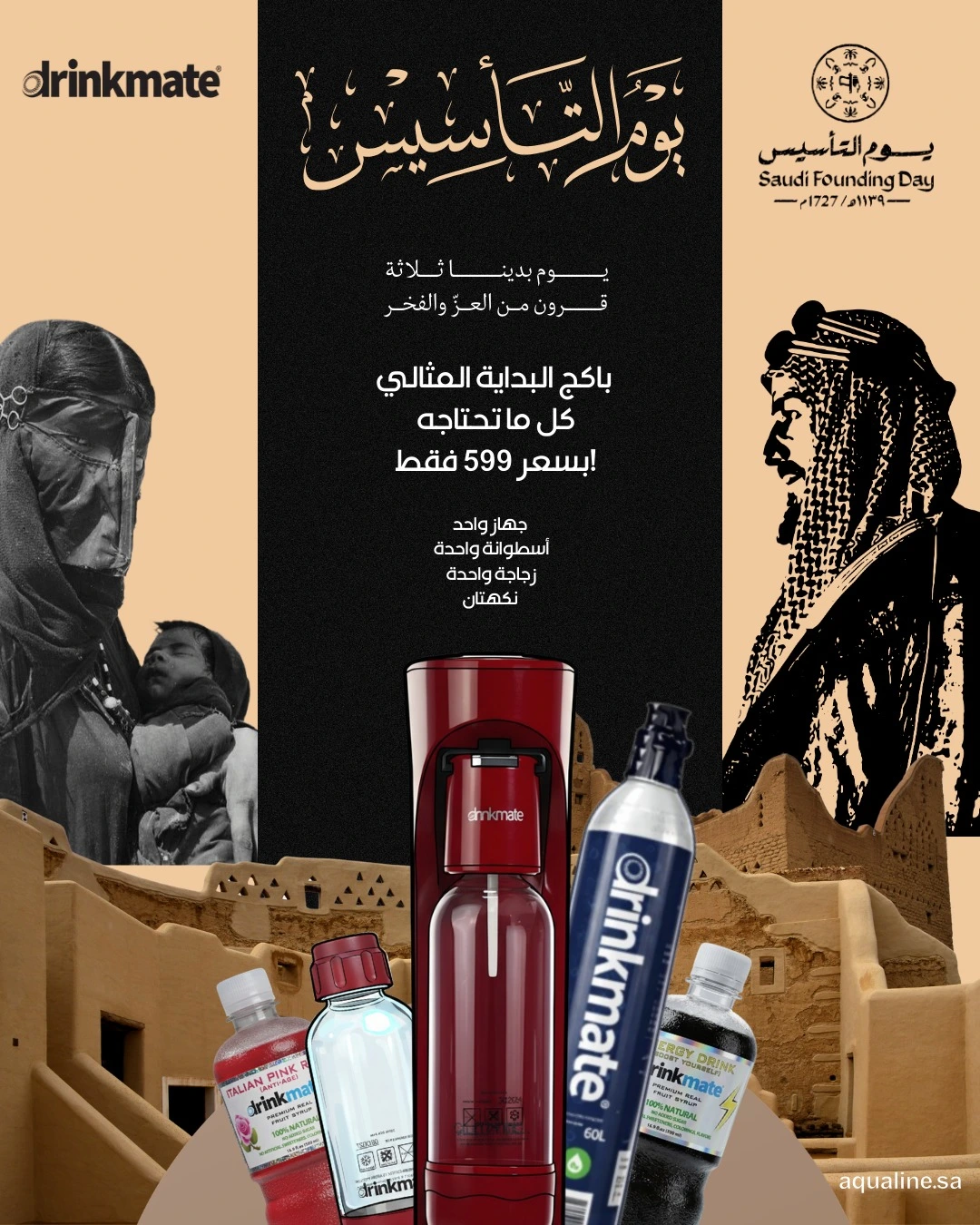 Get 5 Drinkmate Premium Flavours plus ONE FREE 500ml Bottle — now for only 169 SAR.